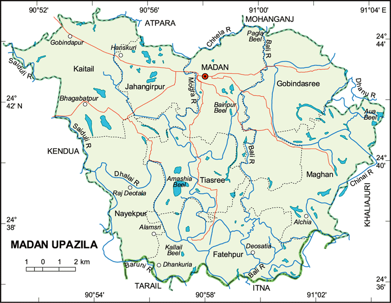 মদন উপজেলার অবস্থান উত্তর অক্ষাংশের ২৩°২৫' এবং ৯০°৫৫' দ্রাঘিমাংশের মধ্যে। এ উপজেলার উত্তরে মোহনগঞ্জ উপজেলা, দক্ষিণাংশে ইটনা ও তারাইল উপজেলা, পশ্চিমে কেন্দুয়া উপজেলা, পূর্বে খালিয়াজুড়ি উপজেলা।